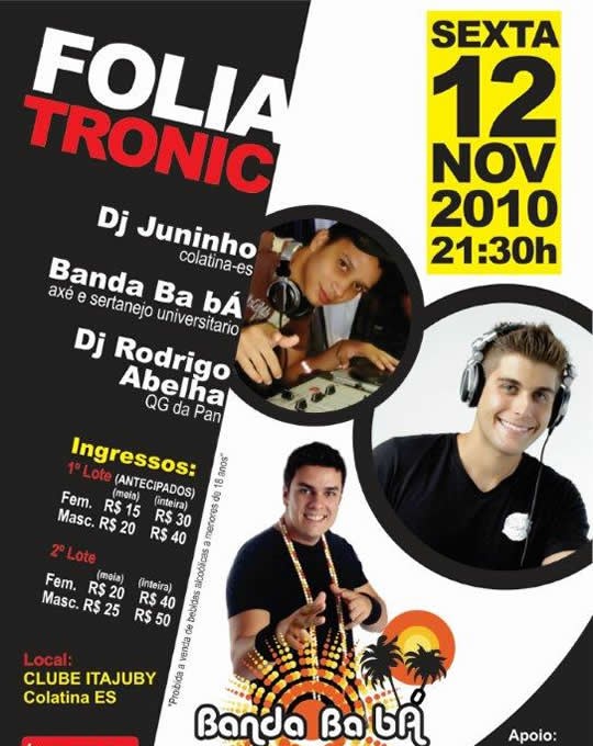 No dia 12 de novembro, a galera de Colatina, norte do ES, vai curtir um grande rock: o Folia Tronic, que será realizado no Clube Itajuby, contará com a Banda Babá, tocando o melhor do axé e do sertanejo universitário, além dos DJ's Rodrigo Abelha, que comanda o QG da Pan em Guarapari, e Juninho. Os ingressos estão à venda na Banca do Briel, em Colatina, e custam R$15 (fem) e R$20 (masc) - valores de meia-entrada / 1º lote.Mais informações sobre o evento na comunidade oficial do Orkut - clique AQUI.